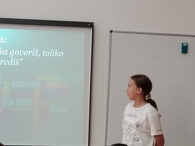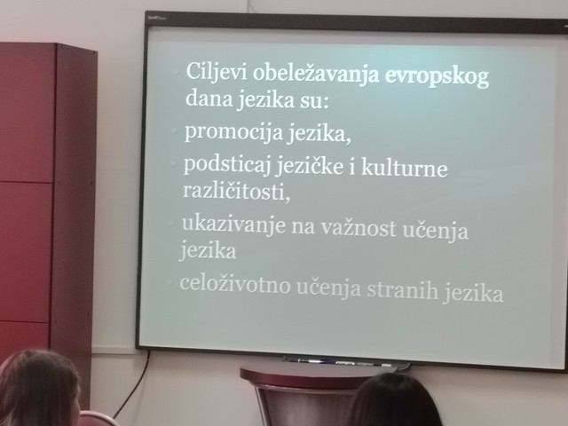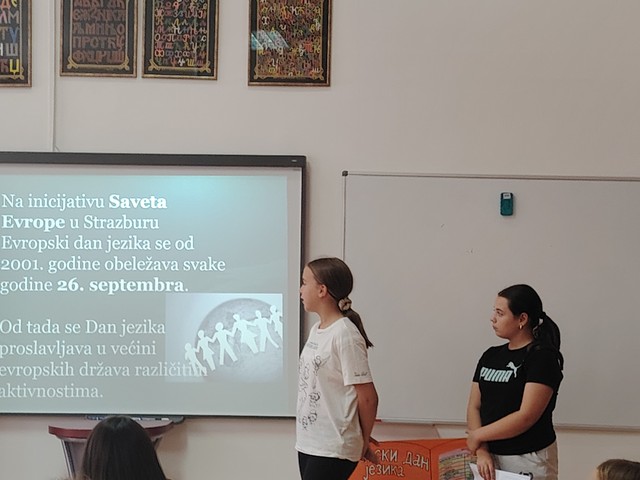 Након уводне речи добродошлице на оба језика која се уче у нашој школи, уследиле су презентације о значају обележавања Европског дана језика. Ученици су имали прилике да виде и пано направљен за обележавање поменутог дана, као и постере у вези са овом овом угледном активношћу.