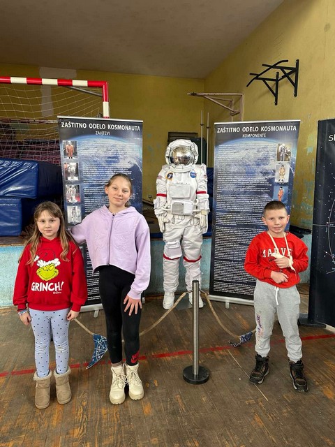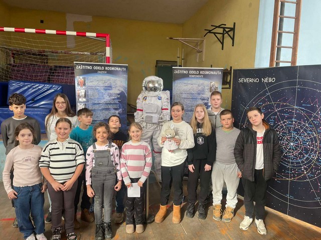 Поред пројекције, ученици су имали прилику да погледају и интерактивну изложбу едукативних панoа и модела свемирских летелица и сателита.
