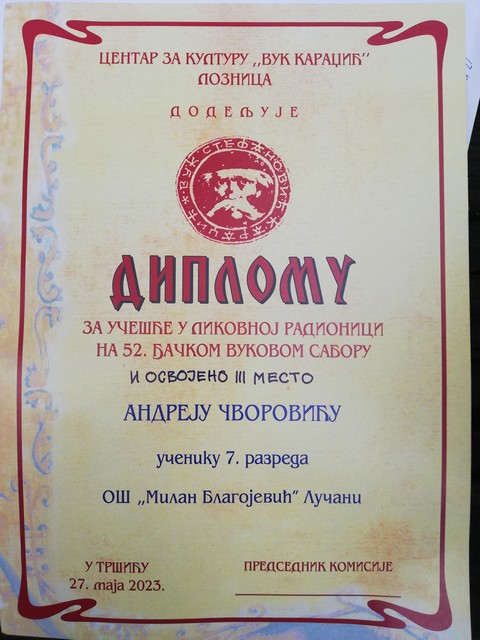 На 52.Ђачком Вуковом сабору који је одржан 25 - 27.05.2023. године у Тршићу ученик Андреј Чворовић 7/2 освојио је треће место у врло јакој конкуренцији ученика из Србије и Републике Српске.
