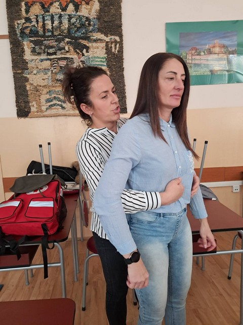 Пет наших учитељица имало је прилику да се упозна са техникама правилног утврђивања стања свести, присуства дисања и пулса, извођењем вештачког дисања и компресија грудног коша, основним поступцима прве помоћи код прелома и уганућа, санацијом различитих врста посекотина и крварења, као и са интервенцијама код респираторних и срчаних проблема и поступањем у случају гушења.